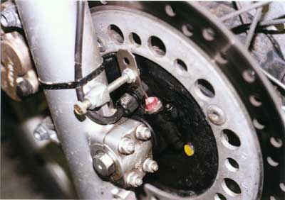 An einem Samstag vormittag ging es dann los. Zuerst habe ich die Tachowelle unten aus der Schnecke geloest und den Anbausatz fuer den Sensor angebaut. Der paßt wunderbar in den vorhandenen Gewindegang fuer die Gabelprotektoren, die bei mir schon lange nicht mehr montiert sind. Dann habe ich den Magneten auf die Plastikverkleidung innen von der Bremsscheibe eingeklebt. Dabei gilt es zu beachten, daß der Abstand zwischen Sensor und Geber unter 1 mm bleibt. Ich musste noch das Halteblech etwas radial verbiegen, damit der Sensor und der Magnet plan aneinander vorbeidrehen. Die offene Schnecke vom Tachoantrieb habe ich mit Verschluß und Heißkleber gedichtet, damit kein Dreck hinein kommt und die Schnecke ruiniert. Was noch wichtig ist, man muß drauf achten, das der Magnet nicht an die Schnecke anstoeßt.
