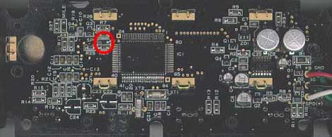Die rotumkreisten Kontakte SPD fuer Speed sind das Ziel. Hier muss ein Widerstand mit 10 kOhm eingeloetet werden. Dazu sollte man einen moeglichst kleinen Lotkolben oder gar, wenn vorhanden, ein SMD-Lotkolben nutzen. Der Widerstand muss nun isoliert und flach runtergebogen werden.