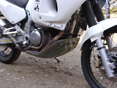 Da das Fahren so ganz ohne Motorschutz auf Strasse ohne Probleme geht, aber schon leichter Schotter ausreicht, das es ordentlich unten am Motorgehaeuse rappelt, habe ich mich entschlossen, doch noch einen Motorschutz zu montieren - den Carbon-Motorschutz der Rallye-Forte von AQ.