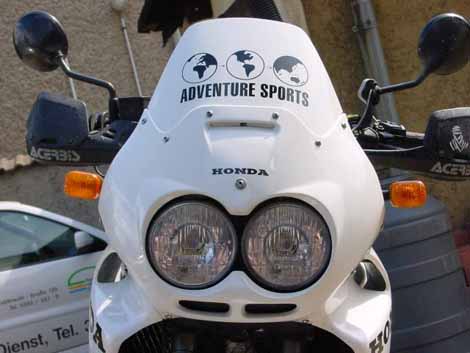 Die kurze Scheibe war zwar sehr gut fuer das Schotter fahren, aber auf der Langstrecke hat der permanente Luftstrom letztendlich doch genervt, zumal ich ausschliesslich mit Crosshelm unterwegs bin. So kam eine neue Verkleidungsscheibe an die Maschine, mit einem kleinem Spoiler, sodass der Wind nach oben abgelenkt wird. Faehrt sich ganz gut ...
