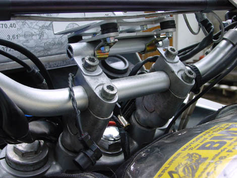 Was kommt noch? Die Verkleidungen der Gabelholme kommen wieder ran, die Acerbis Rallye-Handguards werden gegen die Teile von BMW getauscht, die bieten fuer die Fingerkuppen mehr Schutz vor Wind und Regen. Ueber dem IMO baue ich mir einen weiteren Drehzahlmesser an, ein kleines LED-Band, da die Anzeige im IMO mich gelegentlich wuschig macht.