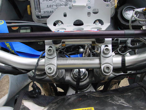 Mittlerweile gab es im Zuge der Umbauten fuer die grosse Russlandreise wieder ein paar Aenderungen. Nunmehr habe ich einen 43l Tank (Touratech) - natuerlich in weiss - montiert. Dazu ist nun noch ein neuer Lenker - ein Renthal - hinzugekommen. Der ist etwas breiter und deutlich hoeher, sodass man nun bequemer reisen kann. Ausserdem habe ich die schon etwas wackeligen Originalspiegel gegen Klappspiegel ausgetauscht. Da ich meine Rallye-Husqvarna wieder auf normale Enduro umgeruestet habe, blieb eine Kombifernbedienung (Roadbook und IMO) ueber, die nun auch am Lenker Platz gefunden hat. Der StreetPilot hat nun einen neuen Platz. Urspruenglich sass die Touratech-Halterung genau auf der Lenkerstrebe des originalen Lenkers, nun habe ich ja den Renthal Dakar montiert. Direkt an die beiden oberen Schrauben der Lenkerhalterung ist nun ein Eigenbauhalter montiert, auf dem nun der Touratech-Halter seinen Platz findet. So ist das GPS nicht so weit vorn/oben und das Roadbook ist noch immer gut ablesbar. Die Querstrebe des Eigenbauhalters wurde aus der Mittelstrebe des originalen Lenkers recyclet.