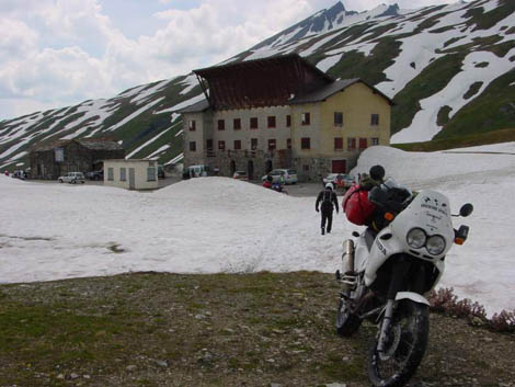 Schneeeinlage am Kleinen St. Bernhard, bis hierhin war es noch nicht so schwierig, kurz Schwung holen und mit viel Gas und viel Schneegewerfe nebst anschieben landete man auf dem ersten Stueck ohne Schnee